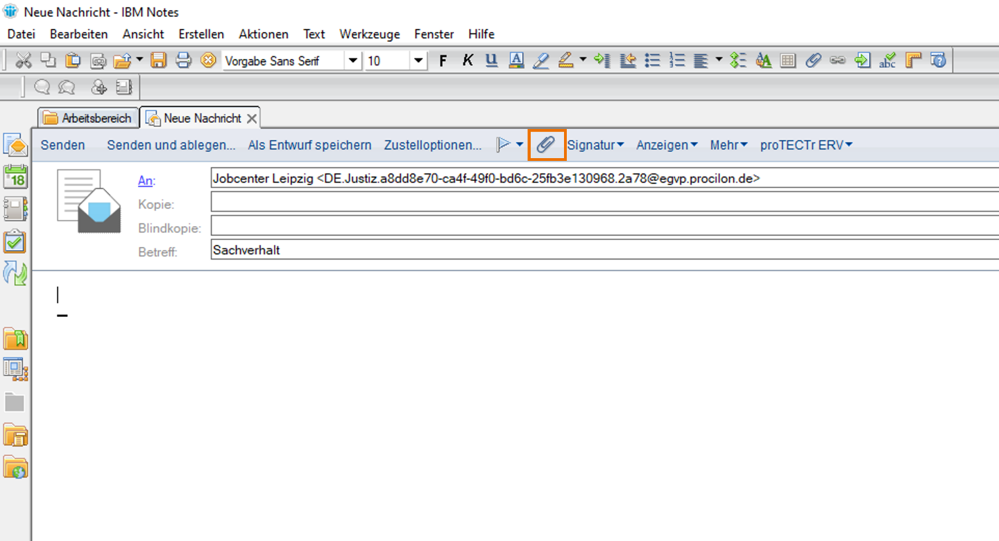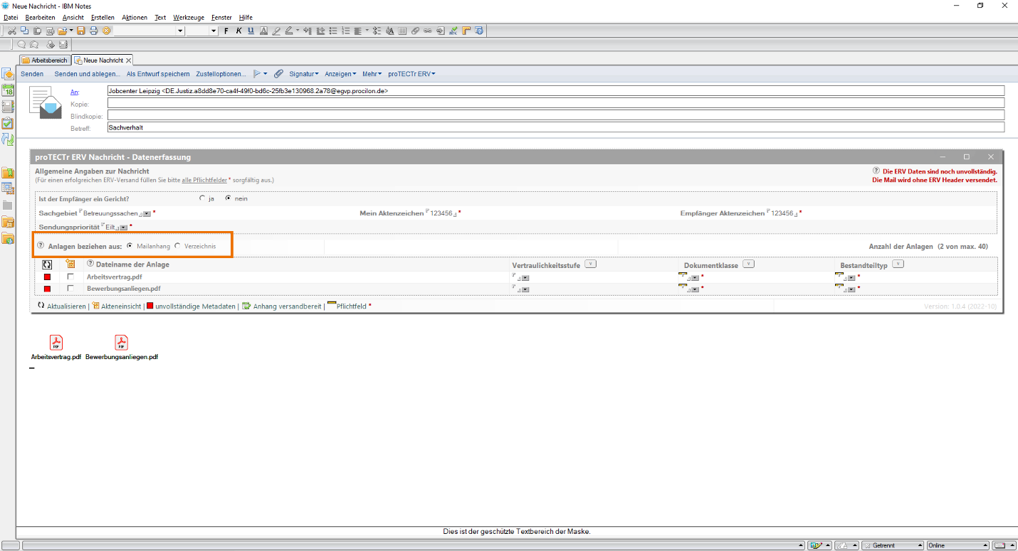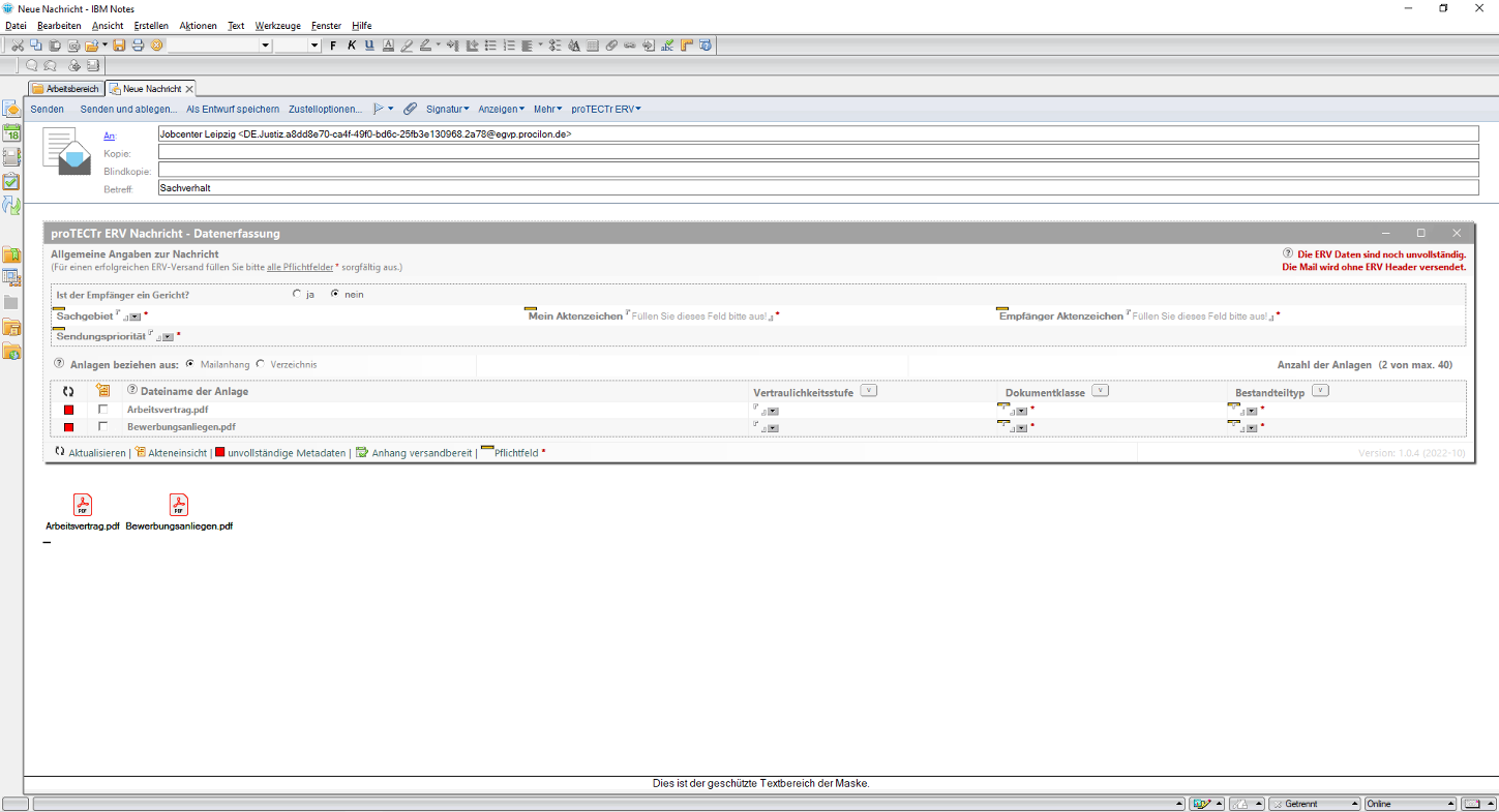 Um die Dateneingabe für die Übergabe der Daten zur Erstellung des XJustiz-Datensatzes zu starten, wird das ERV Add-in benötigt. Dieses blendet sich nahtlos in HCL Notes ein und fragt Informationen zur Nachricht im Allgemeinen und spezifische Informationen zu jedem Dokument/Anlage ab.
