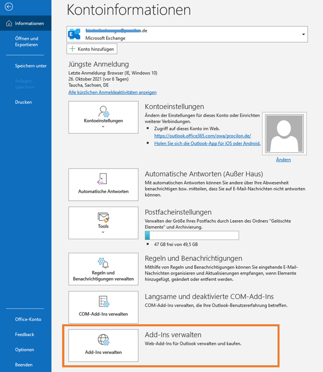 Zur Integration des Add-Ins klicken Sie in Ihrem Outlook auf den Reiter „Datei“ und wählen Sie die Option „Add-Ins verwalten“ aus.