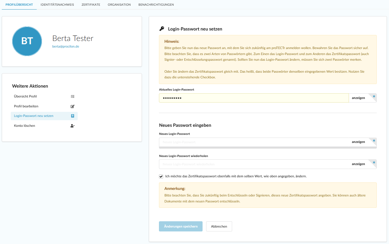 Mit dem Auswählen der Checkbox können Sie Ihr Zertifikats- bzw. Schlüsselpasswort mit demselben Wert anpassen, wie Ihr neues Login-Passwort.