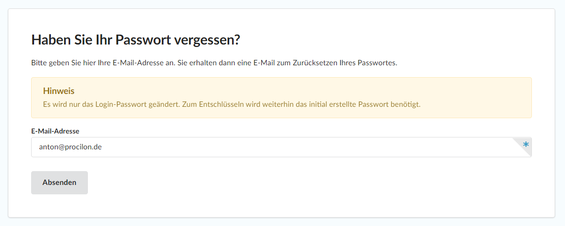 Das Schlüsselpasswort wird während der Registrierung durch Sie festgelegt und kann weder automatisch noch manuell durch procilon geändert oder zurückgesetzt werden. Damit ist sichergestellt, dass nur Sie die Kontrolle über diesen Schlüssel haben. Wenn Sie Ihr Passwort ändern möchten, klicken Sie hier.