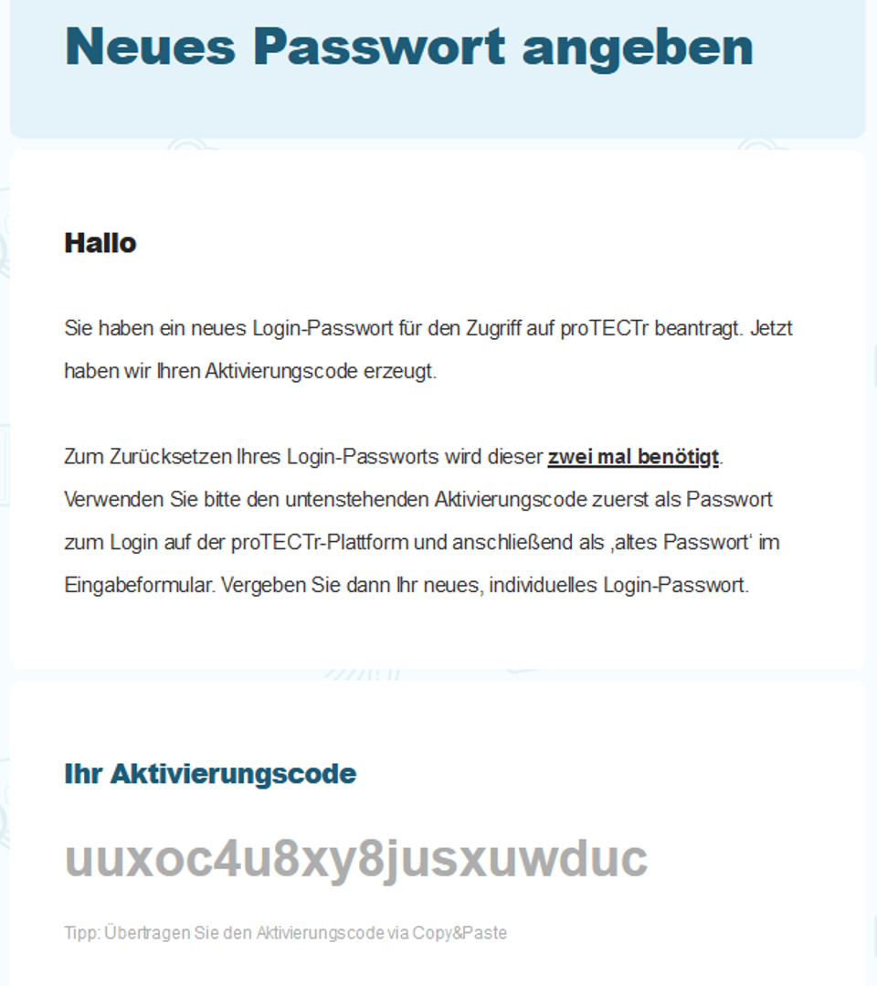 Legen Sie nun ein neues Zugangspasswort fest, indem Sie den erhaltenen Aktivierungscode auf der entsprechenden Seite eingeben und anschließend das neue Passwort durch wiederhole Eingabe setzen.