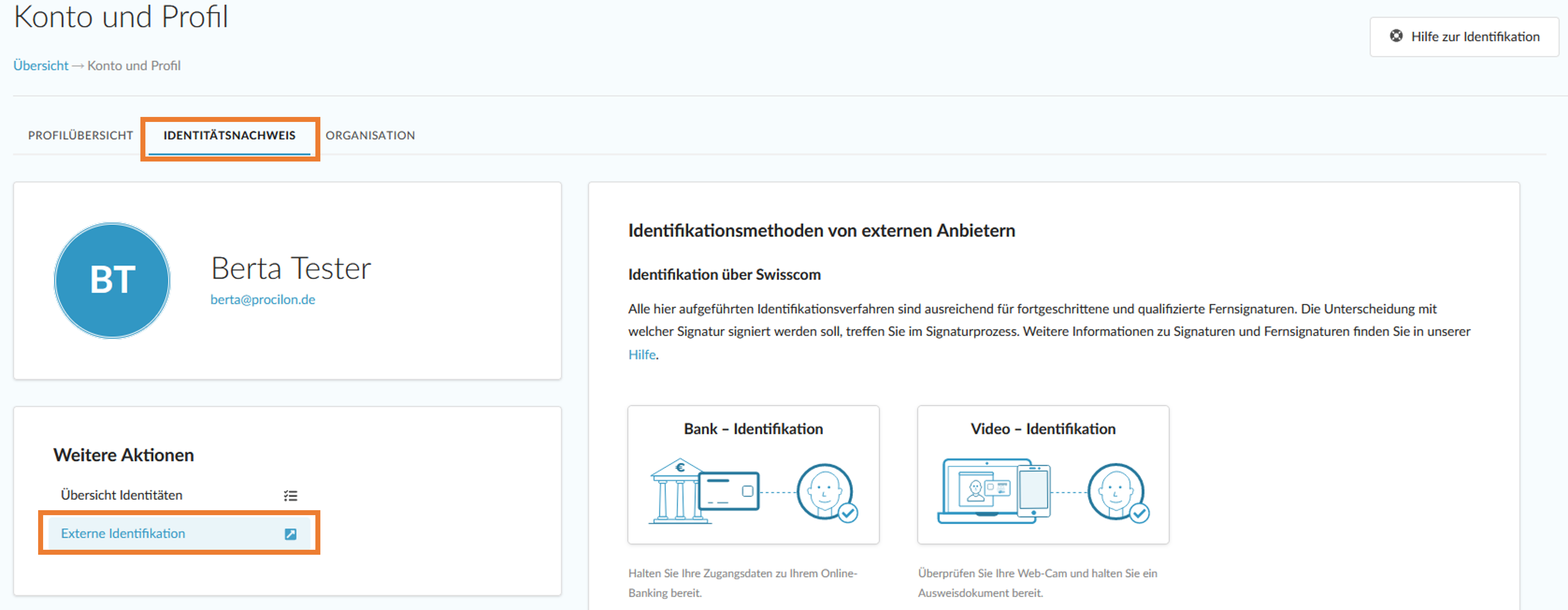 Die Einstiegsmöglichkeiten für die Identifizierung sind im persönlichen Konto des proTECTr gegeben. Gehen Sie dafür auf Ihr Konto unter "Konto und Profil".