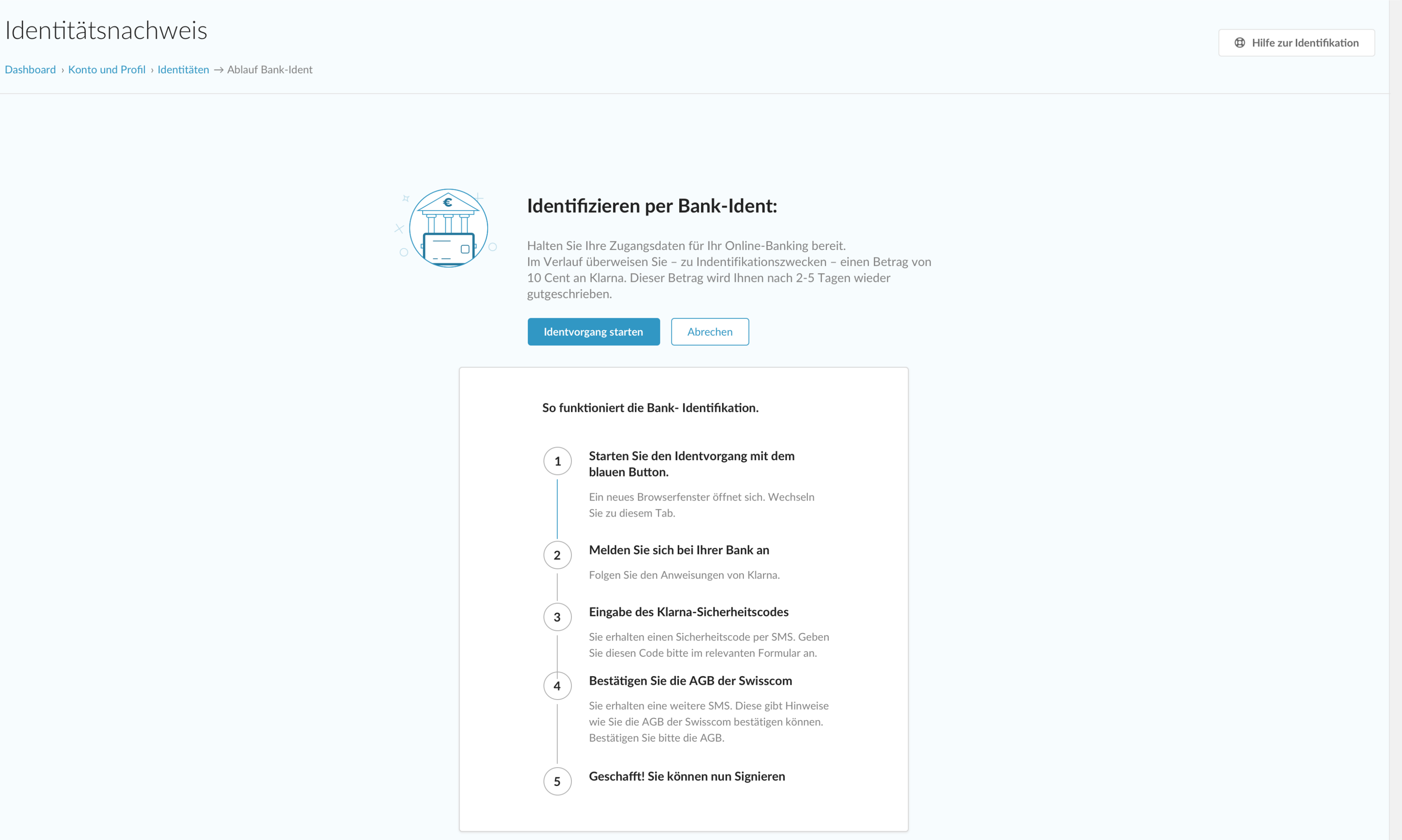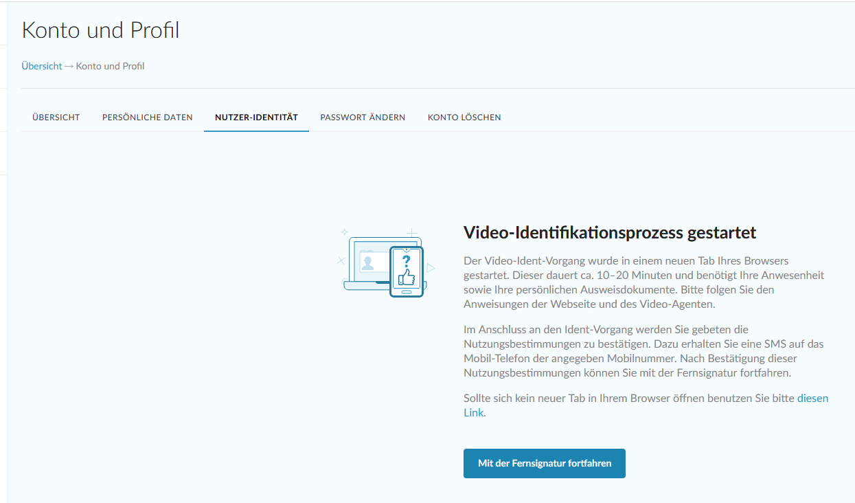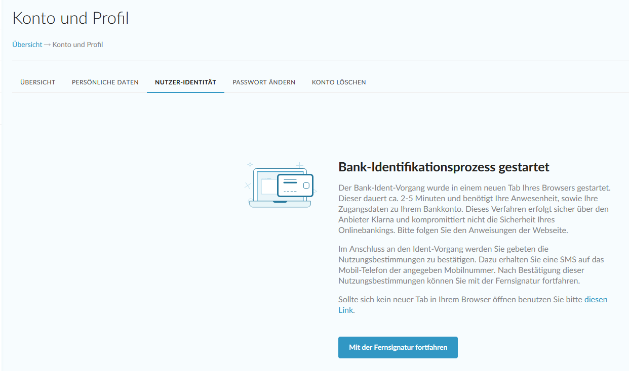 Es öffnet sich der Startbildschirm zum Bank-Identifikationsprozess. Klicken Sie auf den blauen Button "mit der Fernsignatur fortfahren". Das Bank-Ident erfolgt sicher über den Anbieter Klarna.