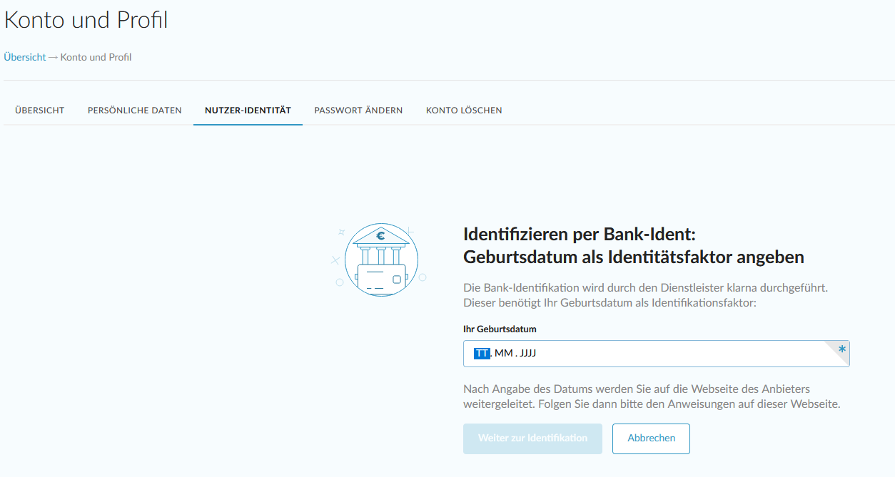 Nachdem Sie den Prozess gestartet haben, werden Sie im ersten Schritt aufgefordert, Ihr Geburtstdatum als Identitätsfaktor angzugeben. Klicken Sie auf "weiter zur Identifikation".
