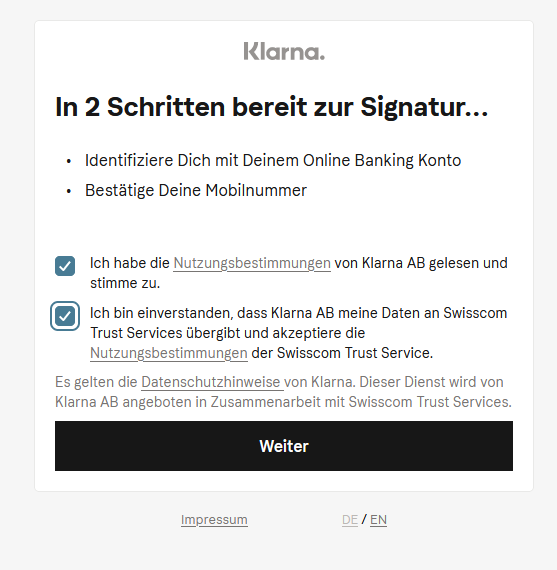 Im nächsten Schritt bestätigen Sie die Nutzungsbestimmungen von Klarna.