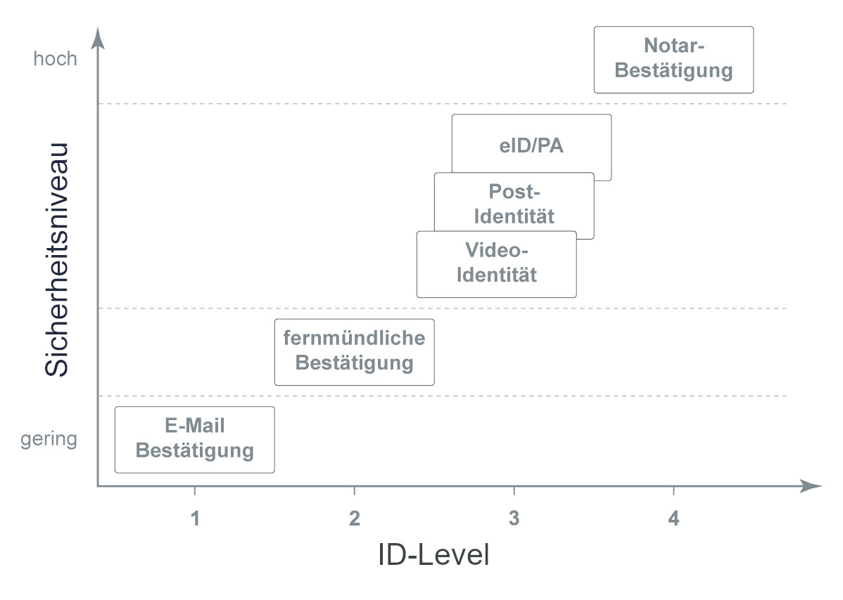 Durch weitere, kostenpflichtige Identifikationsmethoden kann der Mitarbeiter sein ID-Level auf maximal 3 erhöhen. Ihm stehen dann qualifizierte (kostenpflichtige) Dienste wie qualifizierte Signaturen oder qualifizierte Siegel zur Verfügung.