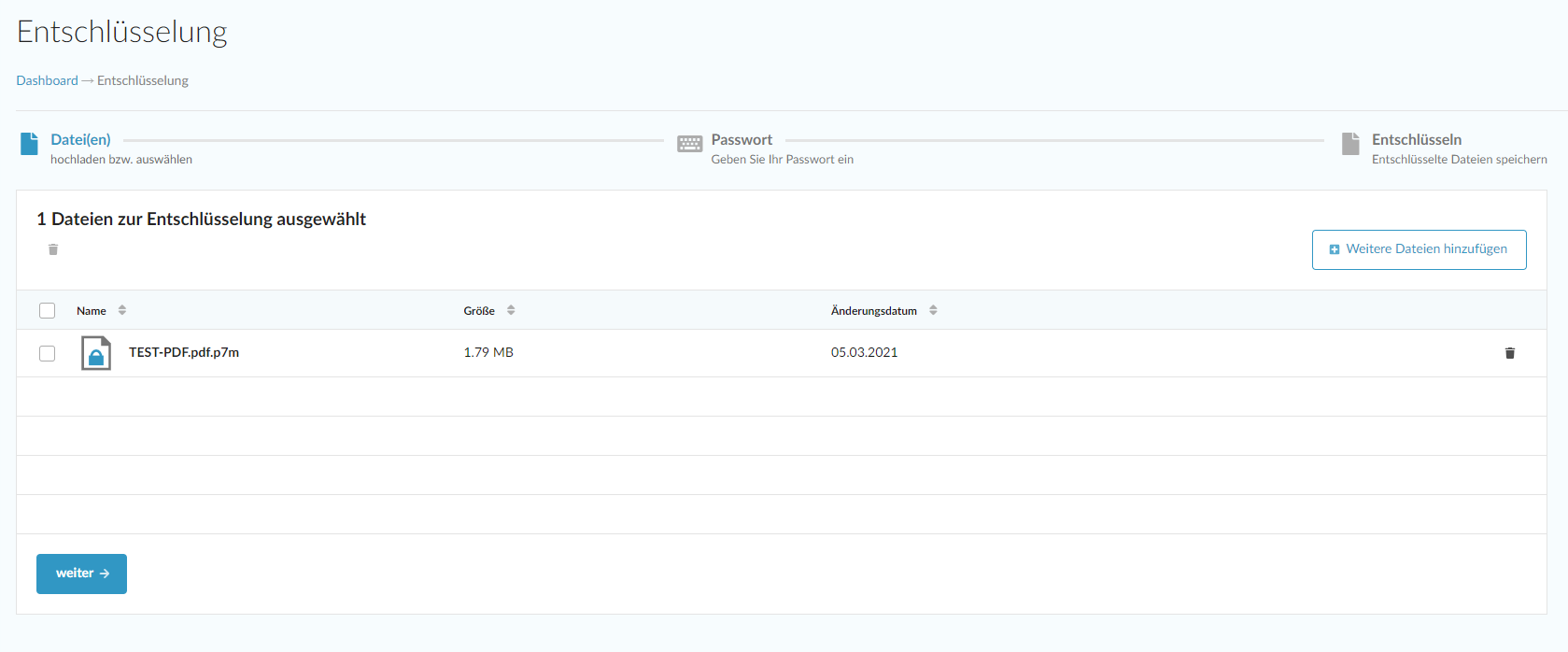 Wählen Sie hierzu die zu entschlüsselnde(n) Datei(en) über den Button "Datei auswählen"