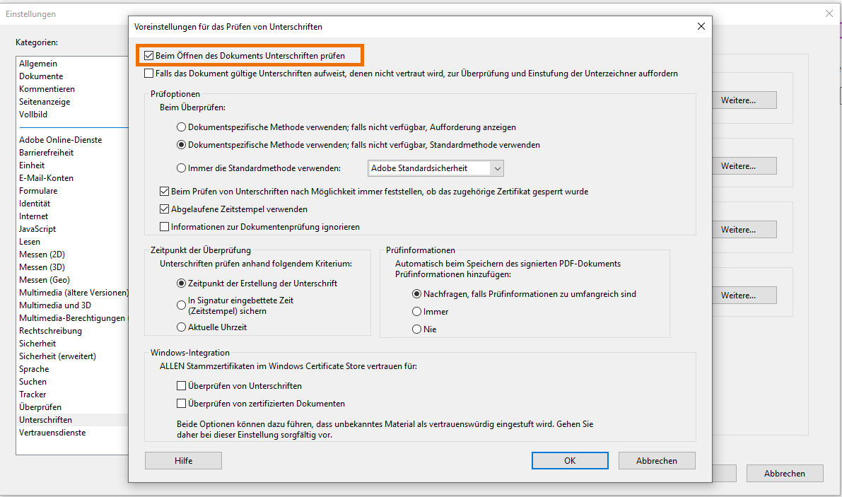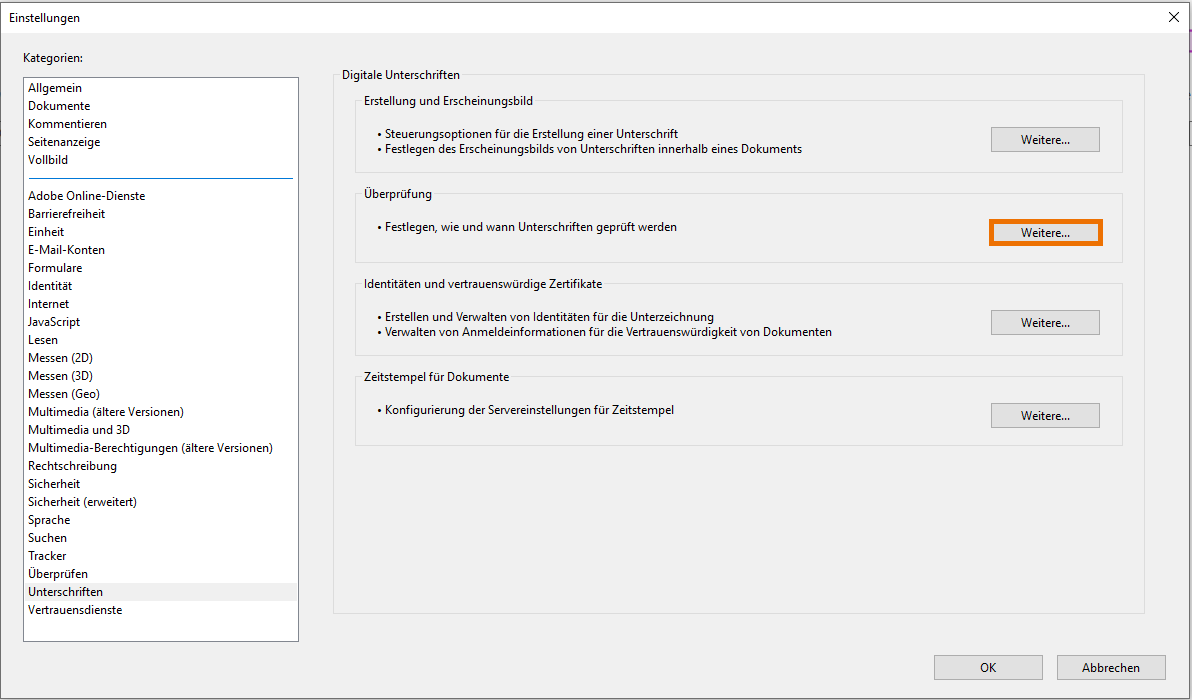 Der Acrobat Reader ist in der Lage schon beim Öffnen von Dokumenten die Überprüfung elektronisch signierter Dokumente - dort bezeichnet als Unterschriften - durchzuführen. Es empfiehlt sich, dies über → Bearbeiten → Einstellungen → Unterschriften als Standard zu definieren. Klicken dafür im Feld Überprüfen auf 'Weitere...'.