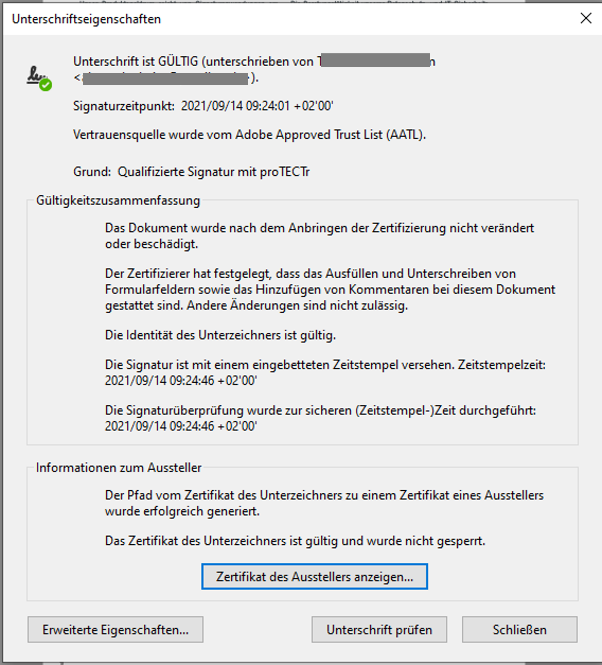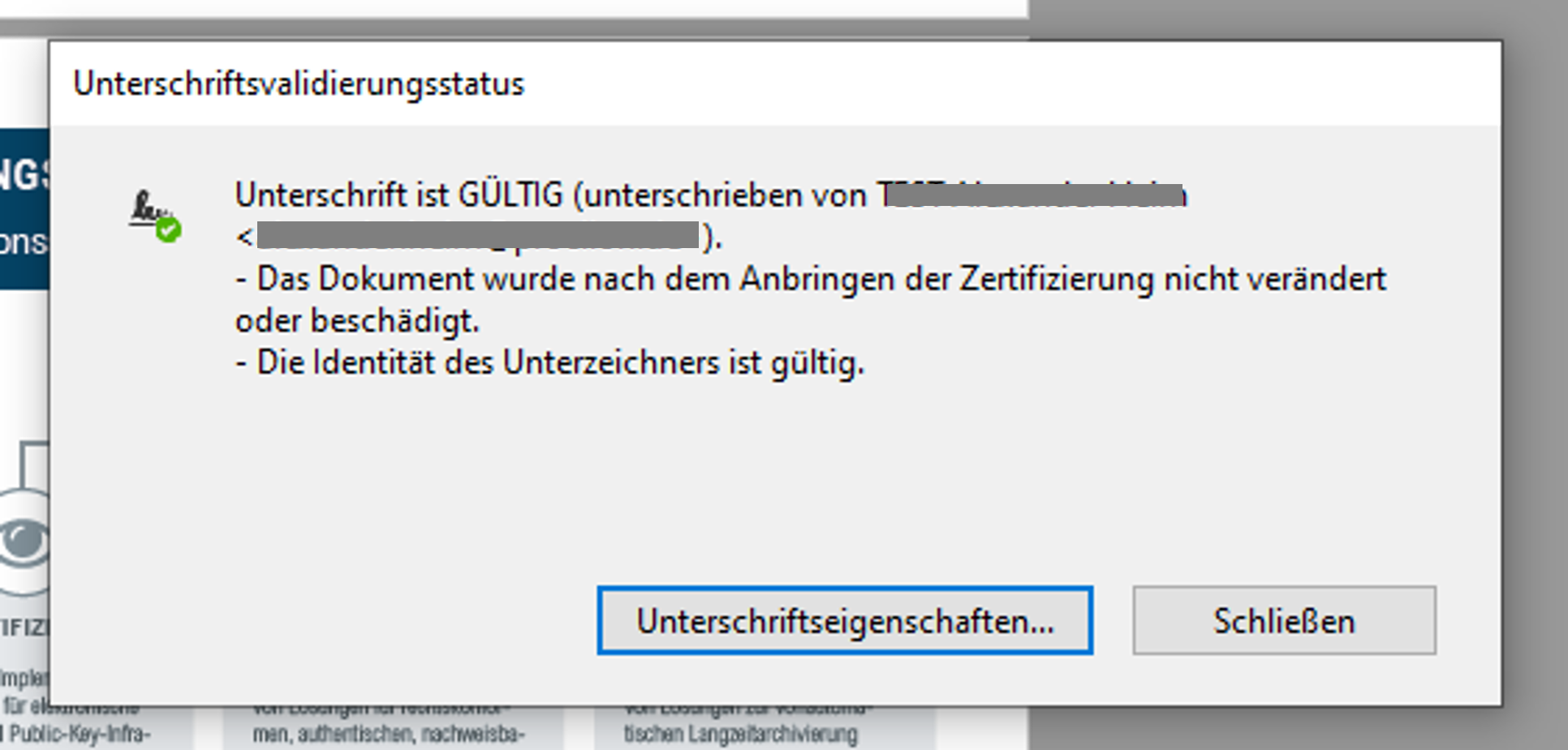 Mit Klick auf 'Unterschriftsfenster' können weitere Informationen angezeigt werden. Neben Informationen zum Unterzeichner wird dort auch eine Aussage darüber gemacht, ob das Dokument nach der Signatur verändert wurde. Es wird also eine Aussage zur Integrität der Daten gemacht.