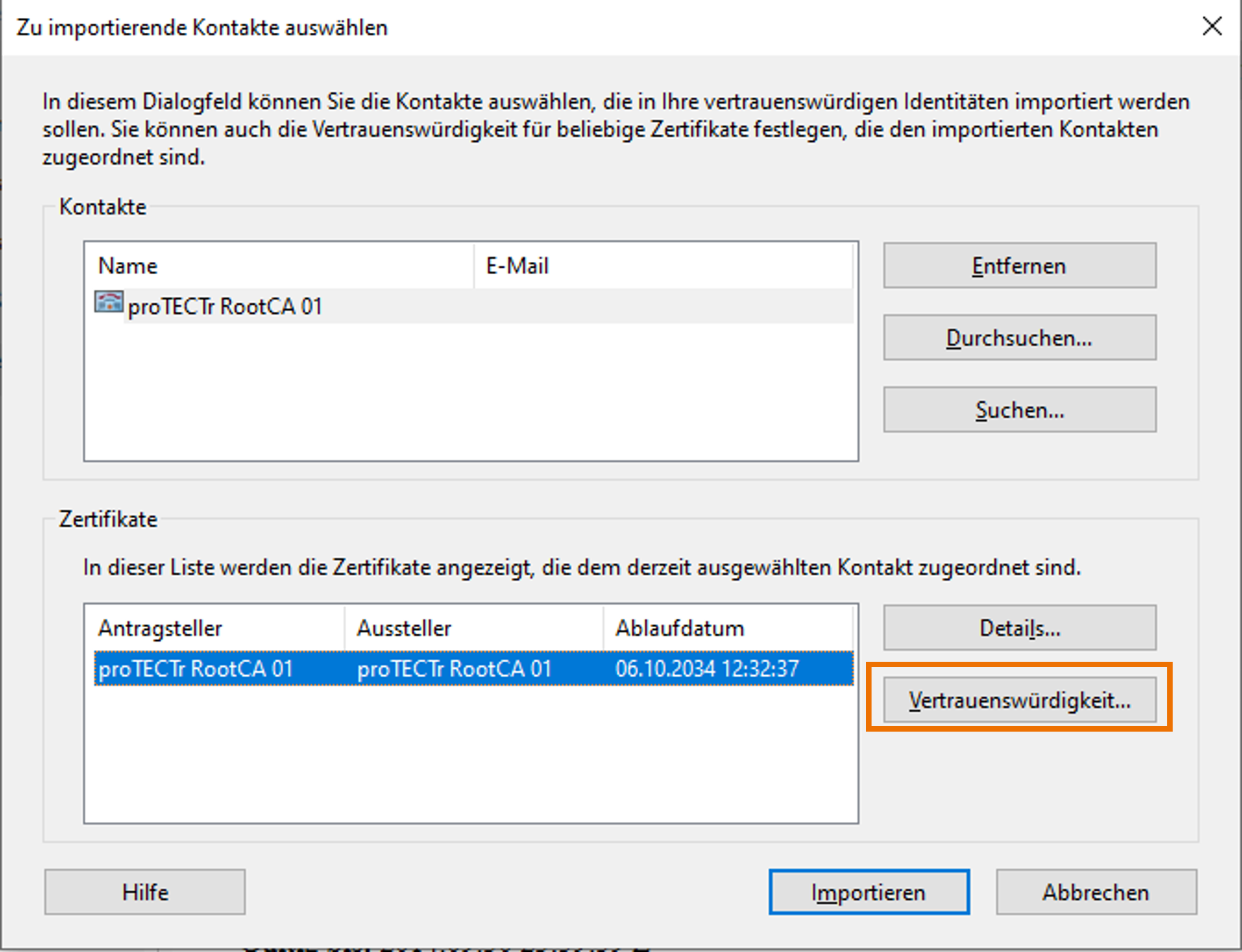 Wichtiger Hinweis: Insbesondere bei dem Import muss die Vertrauenswürdigkeit der Zertifikate vermerkt werden. Dafür das gewünschte Zertifikat im unteren Bereich wählen und auf 'Vertrauenswürdigkeit...' klicken.