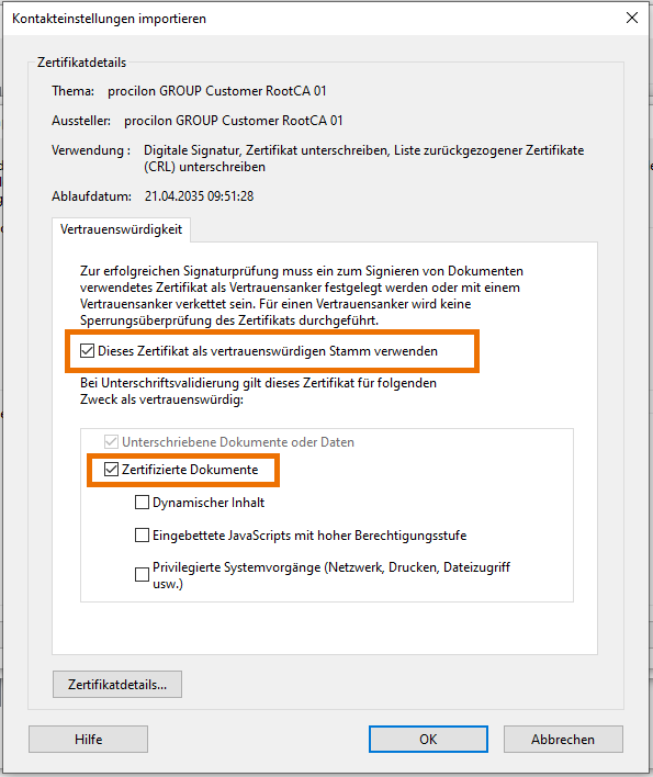 In den Einstellungen zur Vertrauenswürdigkeit müssen die Checkboxen wie folgt gesetzt sein: