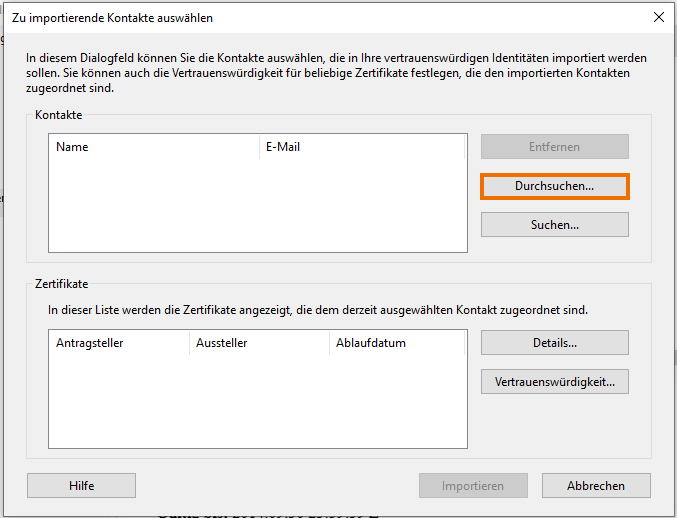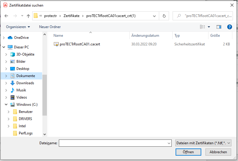 Mit dem Klick auf Durchsuchen öffnet sich ein Fenster, wo Sie das entsprechende Zertifikat auswählen und mit Klick auf "öffnen" importieren können.