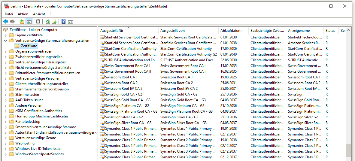 Nach dem Klick auf 'Weitere...' und Auswahl 'Vertrauenswürdige Zertifikate' werden die vorhandenen angezeigt.