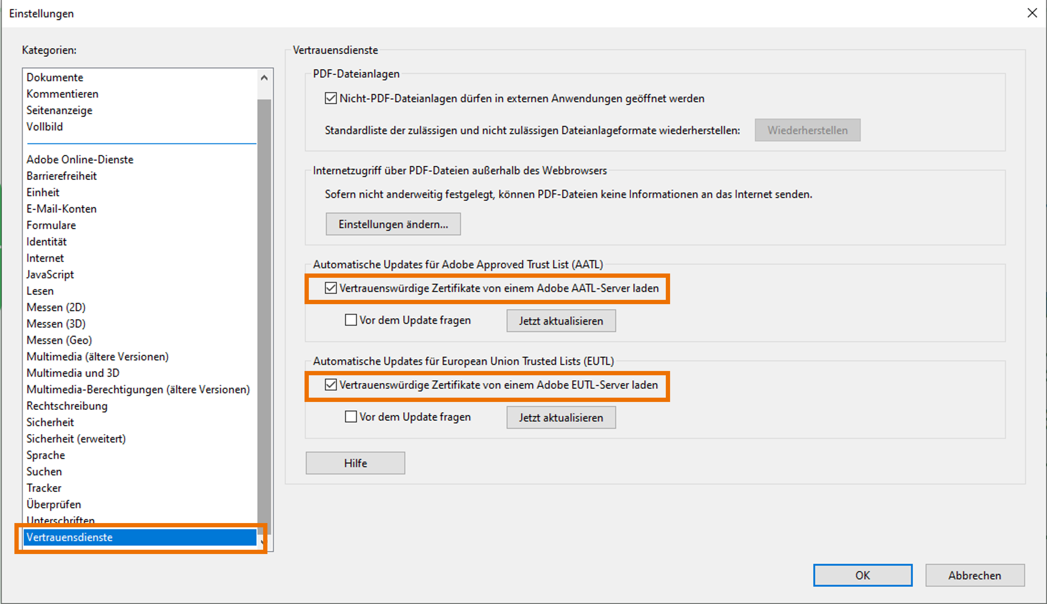 Für die Zertifikatsprüfung sollten Sie die European Union Trusted Lists und ggf. auch die Adobe Approved Trust List im Adobe aktiviert haben. Gehen Sie dazu unter Bearbeiten auf Einstellungen. In der Kategorie Vertrauensdienste aktivieren Sie durch einen Klick die jeweiligen Checkboxen für die beiden Listen.
