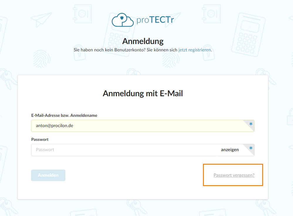 gelangen Sie zum proTECTr-Login. Dort melden Sie sich mit Ihrer registrierten E-Mail-Adresse und dem Aktivierungscode an.
