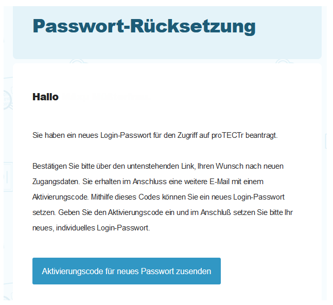 Nach Bestätigung Ihrer E-Mail-Adresse erhalten Sie einen Aktivierungscode zum Zurücksetzen Ihres Passwortes.