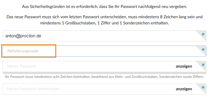 Legen Sie nun ein neues Zugangspasswort fest, indem Sie den erhaltenen Aktivierungscode auf der entsprechenden Seite eingeben und anschließend das neue Passwort durch wiederhole Eingabe setzen.