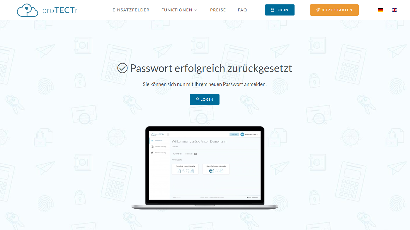 proTECTr verwendet 2 unterschiedliche Passwörter. Ein Login-Passwort für den allgemeinen Zugang zur proTECTr-Plattform sowie ein separates Schlüssel-Passwort zur Entschlüsselung.