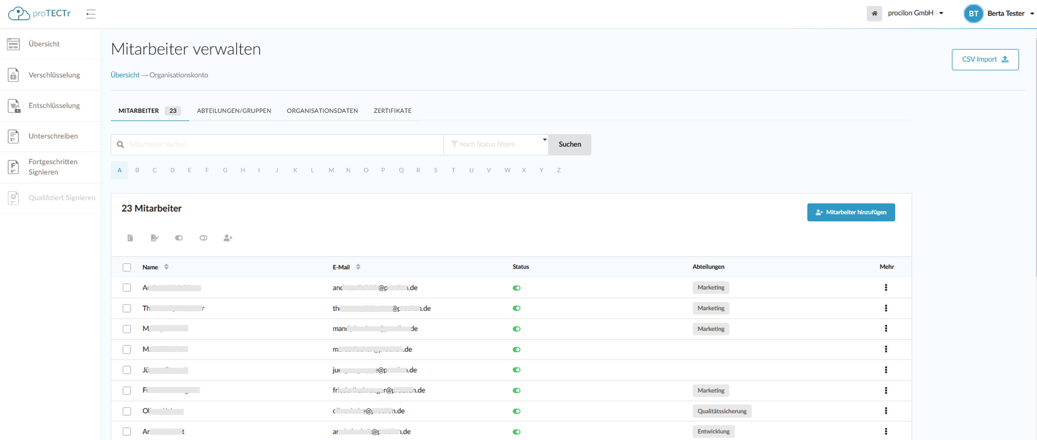 Für den Fall, dass bereits Gruppen/Abteilungen im Organisationskonto angelegt wurden, gibt es die zusätzliche Möglichkeit, bei der Verwendung des CSV-Imports Mitarbeiter diesen Gruppen zuzuweisen. Beim „manuellen“ Anlegen der Gruppen vergibt der proTECTr automatische spezielle IDs. Diese werden GroupIDs genannt.
