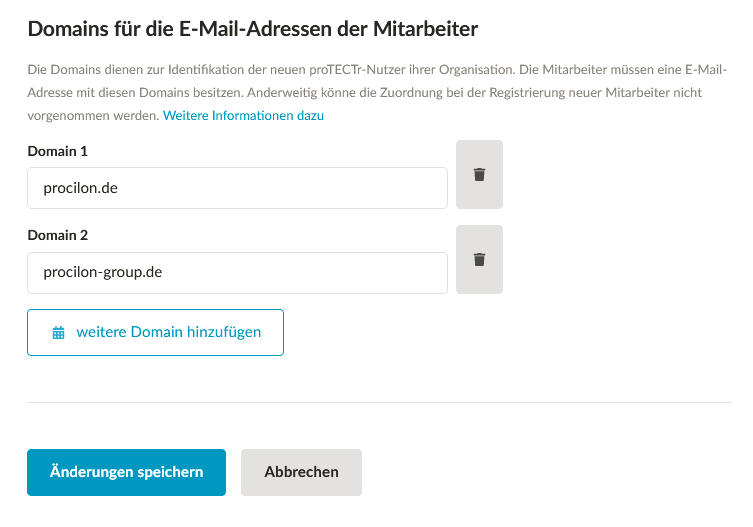 Im proTECTr können Sie Domains für die E-Mail-Adressen Ihrer Mitarbeiter anlegen. Die Domains dienen zur Identifikation der neuen proTECTr-Nutzer ihrer Organisation. Die Mitarbeiter müssen eine E-Mail-Adresse mit diesen Domains besitzen. Anderweitig kann die Zuordnung bei der Registrierung neuer Mitarbeiter nicht vorgenommen werden.