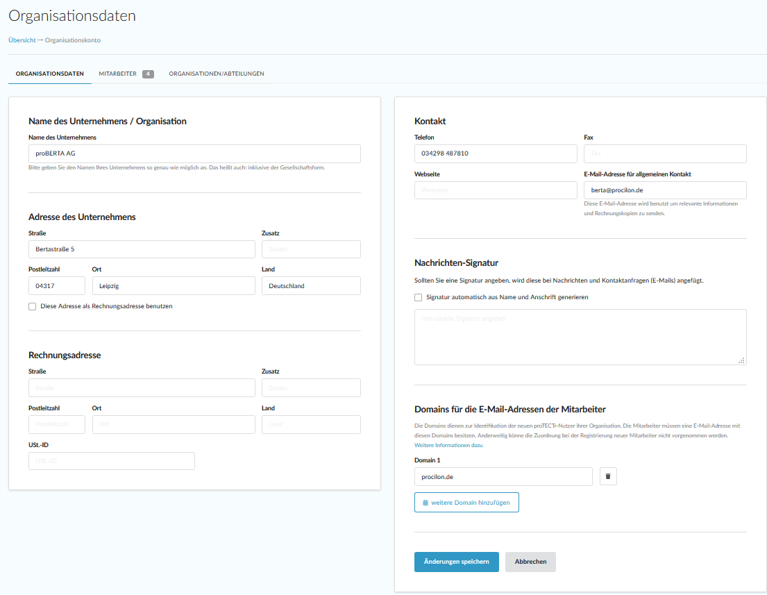 Die Stammdaten Ihrer Organisation finden Sie im Organisationskonto unter dem Reiter 'Organisationsdaten'. Dort können Sie die Stammdaten Ihres Unternehmens, wie Firmenname, Anschrift, Rechnungsadresse und weitere Kontaktdetails eingeben. Hier haben Sie außerdem die Möglichkeit, eine Nachrichten-Signatur für E-Mails zu erstellen und Mail-Domains anzulegen.