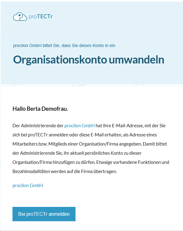 Der Eingeladene bekommt im Anschluss eine E-Mail, in welcher er über die Einladung zum Organisationskonto informiert wird. Mit Klick auf den enthaltenen Link zu proTECTr kann er sich auf der Plattform einloggen und der Zuordnung zum Unternehmen zustimmen. Er ist dann Mitglied Ihrer Organisation.
