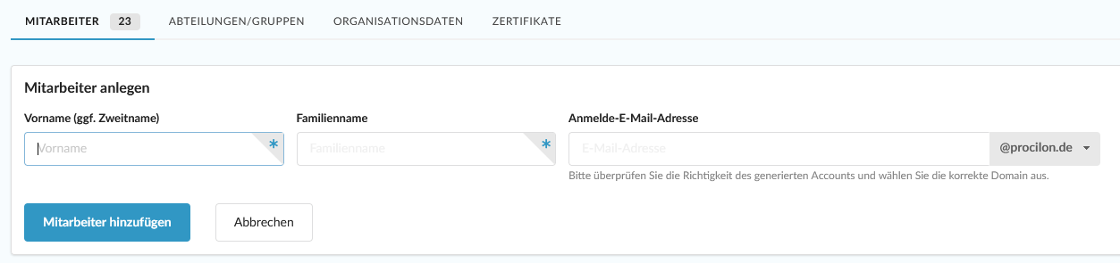 Hinweis: Die E-Mail-Adressen der zukünftigen Mitarbeiter müssen der angemeldeten Domains der Organisation entsprechen. Sollte dies nicht der Fall sein, wird dieser Mitarbeiter nicht erstellt.