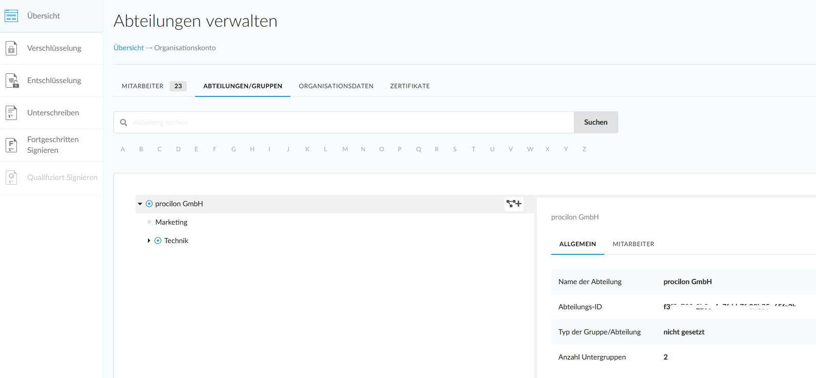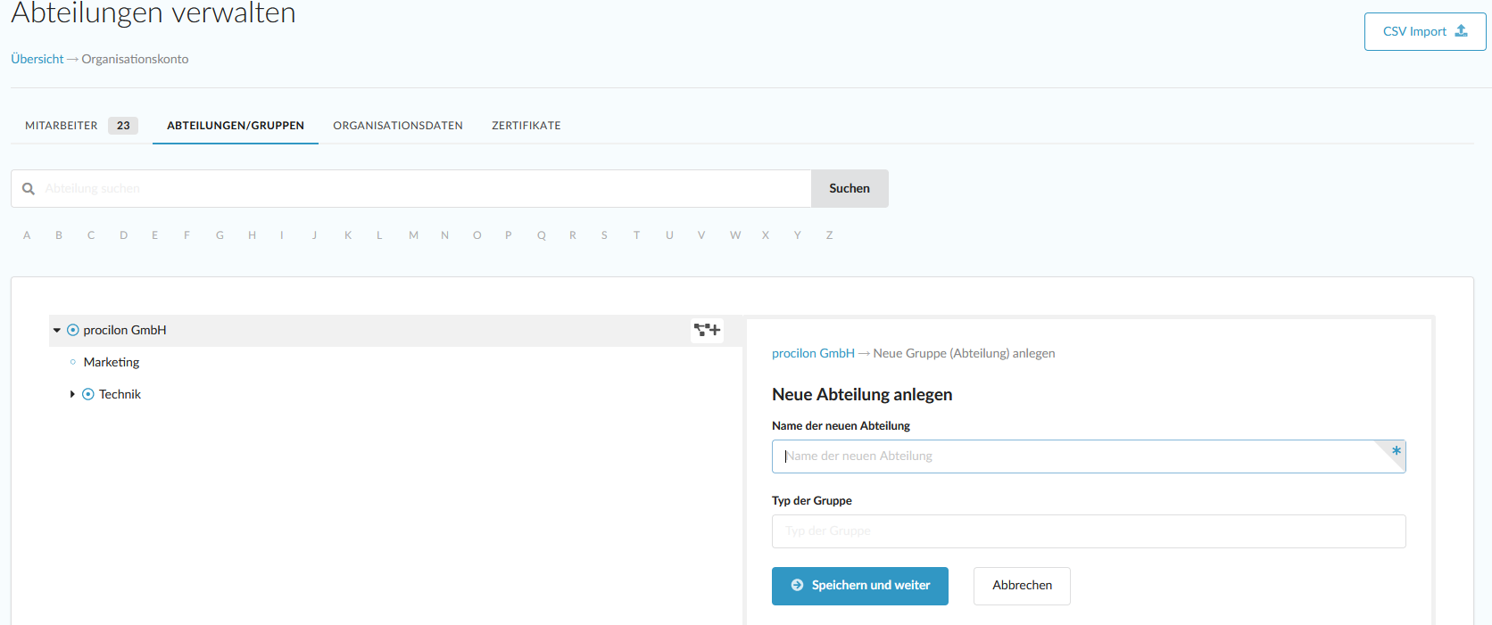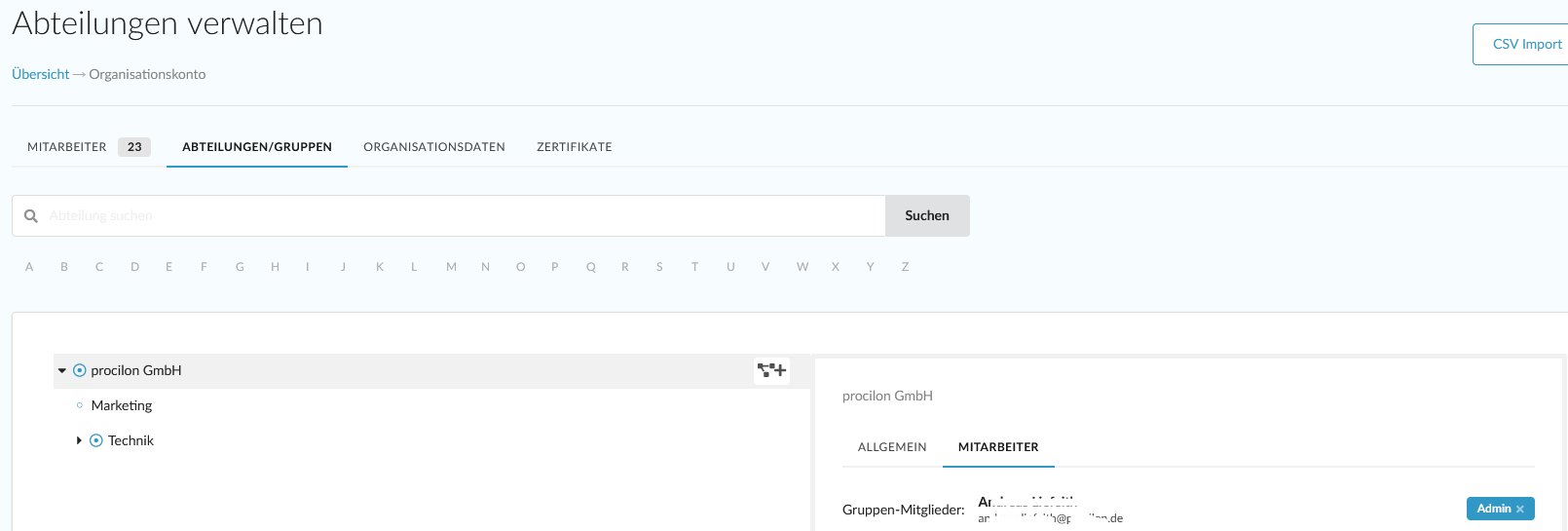 Im Organisationskonto können Sie nicht nur Ihr Unternehmen und Ihre Mitarbeiter verwalten, sondern auch eine Abteilungsstruktur anlegen. In dieser können Sie die unterschiedlichen Mitarbeiter einer entsprechenden Abteilung zuordnen. Gehen Sie dazu ins Organisationskonto auf den Reiter 'Abteilungen/Gruppen'. Im Feld auf der rechten Seite können Sie unter dem Reiter 'Mitarbeiter' Personen zu Gruppen hinzufügen.