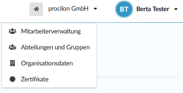 Sie müssen Administrator des Unternehmens sein, um Anwender Ihrem Unternehmen zuzuordnen. Der Admin ist die Person, die für Ihr Unternehmen ein entsprechendes Organisationskonto beantragt. Klicken Sie auf den Namen Ihrer Organisation neben Ihrem Profilsymbol oben rechts in der Anwendung und wählen Sie 'Mitarbeiterverwaltung' aus.